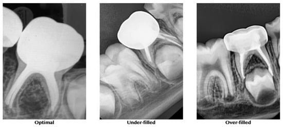A postobturation radiograph was taken for further evaluation and comparison of the quality of obturation between the groups. The quality of the root canal obturation was recorded, according to O’Riordan and Coll [] as optimal (1 mm short of the apex), underfilled (2 mm short of the apex), or overfilled (beyond the apex) (Figure 3).