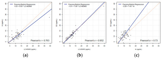 (a–c) Passing-Bablok regressions of FT4 (LC-MS/MS, IA, ED) using the FT4 data including outliers (N = 62), compared pairwise.