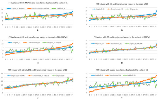As shown in Table 3, mean, SD and CV are reduced after the transformation into the reference interval scale (9 to 16 pg/mL) of IA. In particular, SD and CV of FT4 values are respectively reduced by over 46% and 43% when transformed from LC-MS/MS to IA. For transformation from ED to IA, the reductions in SD and CV are around 56% and 55%, respectively. Mean values are reduced by 5% and 3% when transforming from LC-MS/MS and ED to IA scales, respectively. Compared to the original curve of FT4 values, Figure 2A,B show that the transformation curves appear to be flat for both LC-MS/MS and ED. The trend of converted values maintained a similar pattern as the original values.