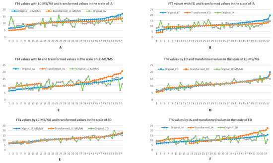 As shown in Figure 4A–C, the FT4 values with ED were in the middle of the transformed values with LC-MS/MS and IA in the reference scale of ED. In other words, transformed FT4 values oscillate around the values in ED, particularly with fluctuations associated with IA being larger than LC-MS/MS. There are similar observations in the reference scale of LC-MS/MS as demonstrated in Figure 4B. However, as for FT4 measured in the IA scale, the transformed FT4 values were higher than the original values measured in IA scale for small FT4 values while the transformed values were lower than the scaled value for bigger FT4 values with IA as shown in Figure 4A. These observations facilitate understanding of different FT4 transformation patterns into any specific scale of interest. As to the case of using piecewise linear transformation, as demonstrated in Figure 4D–F, similar patterns can be found in contrast to linear transformation. However, the fluctuations of transformed FT4 values around the scaled FT4 value were considerably reduced in general. There were still non-monotonous trends between the transformed values with the scaled values in IA as shown in Figure 4D.