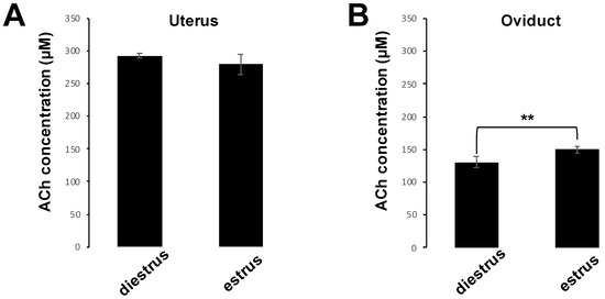 ACh concentrations in mouse uterus and oviduct during diestrus and estrus phase. (A,B) Acetylcholine (Ach) concentration (µM) in uterus (A), and oviduct (B). Data shown as mean ± SD (n = 5; ** p < 0.01).