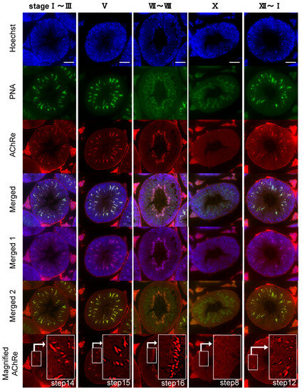 Testis AChRe localization analysis by immunocytochemistry. (Merged 1): Merged image of nuclear and AChRe. (Merged 2): Merged image of acrosome and AChRe. Note the immunoreactivity detected in spermatids from step 12 onwards. AChRe was expressed in spermatids from the end of spermatogenesis process to just before ejaculation. Blue, nuclear (Hoechst 33342); green, acrosome (FITC-PNA); red, AChRe; bars = 50 µm.