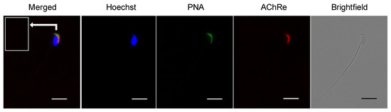 For analysis of total sperm lysate, spermatozoa suspended in HTF medium were obtained by centrifugation at 7900× g for 5 min at 4 °C and washed with phosphate-buffered saline (PBS). The final pellet was resuspended in RIPA buffer (50 mM Tris-HCL, pH 7.6, 150 mM NaCl, 1% Nonidet P-40, 0.5% sodium deoxycholate, and 1% protease inhibitor) (Nacalai Tesque, Kyoto, Japan) and sonicated to extract the proteins. The samples were centrifuged at 7900× g for 5 min at 4 °C and the supernatants were collected. Protein concentrations of the supernatants were determined using a bicinchoninic acid protein assay kit (Thermo Fisher Scientific, Waltham, MA, USA). Further, an equal volume of 2× sample buffer (Nacalai Tesque) was added to the sample and the mixture was boiled at 100 °C for 5 min. Proteins were separated by 10% SDS-PAGE (150 V, 0.4 A, 65 min) and transferred to polyvinylidene difluoride membranes. Protein Ladder One Triple-color for SDS-PAGE (Nacalai Tesque) was used as a protein marker. The membranes were blocked for 1 h with Blocking One (Nacalai Tesque) at room temperature and incubated overnight at 4 °C with a 1:1000 dilution of the primary antibody (anti-AChRe) (sc376747, Santa Cruz Biotechnology, Dallas, TX, USA) diluted in Blocking One and PBS mixture (Blocking One:PBS, 1:4). The membranes were washed thrice with PBS-T (PBS containing 0.1% Tween 20) and incubated with a 1:2000 dilution of horseradish peroxidase (HRP)-conjugated anti-mouse IgM antibody (Santa Cruz Biotechnology) for 2 h at room temperature. After two washes, the membranes were treated with Chemilumi One (Nacalai Tesque), and images were obtained using an LAS-3000-mini Lumino Image Analyzer (Fujifilm, Tokyo, Japan).
