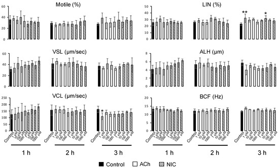 Computer-assisted sperm analysis (CASA) measurements of the effects of ACh and NIC on mouse sperm motility. Data shown as mean ± SD (n = 4; * p < 0.05; ** p < 0.01). VSL, straight-line velocity; VCL, curvilinear velocity; LIN, linearity; ALH, amplitude of lateral head displacement; BCF, beat cross frequency.