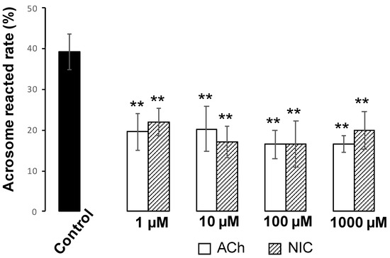 Effects of ACh and nicotine (NIC) on the sperm acrosome reaction. ACh and NIC administration suppresses AR. Mouse spermatozoa were capacitated in human tubal fluid (HTF) medium for 1 h. Phosphate-buffered saline (PBS) or various concentrations of ACh or NIC were added to equivalent aliquots of the suspension (200 µL, 5 × 106 cell/mL) and cultured for 3 h. All the groups contained 0.1% dimethyl sulfoxide (DMSO). Sperm acrosomal disappearance rates were evaluated by calculating the number of PNA-negative sperm out of the total counted sperm. Data shown as mean ± SD (n = 3; ** p < 0.01).