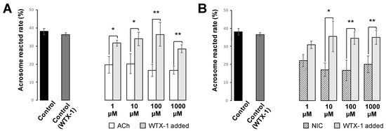 Effect of AChRe antagonist on sperm AR suppression caused by ACh and NIC. (A,B) Administration of WTX-1, an AChRe-specific antagonist, 15 min before the addition of ACh and NIC, inhibited the effects of ACh (A) and NIC (B) on AR. All the groups contained 0.1% DMSO. The experiments in Figure 6 and Figure 7 were performed on the same day, and the data for control, ACh, and NIC treated group are the same as in Figure 6. Sperm acrosomal disappearance rates were evaluated by calculating the number of PNA-negative sperm out of the total sperm. Data shown as mean ± SD (n = 3; * p < 0.05; ** p < 0.01).