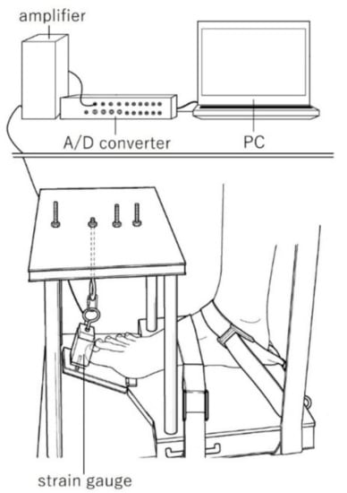 The MVC torque was measured using a custom-made torque-measuring device. This device recorded the tensile force data from the strain gauge (TU-BR, TEAC, Tokyo, Japan), and converted it from analog to digital using an A/D converter (Power Lab, AD instruments, Bella Vista, NSW, Australia) via an amplifier (DPM-711B, Kyowa Electronics, Tokyo, Japan). The torque values were calculated as the corresponding tensile forces multiplied by the 0.10 m lever arm of the force plate.