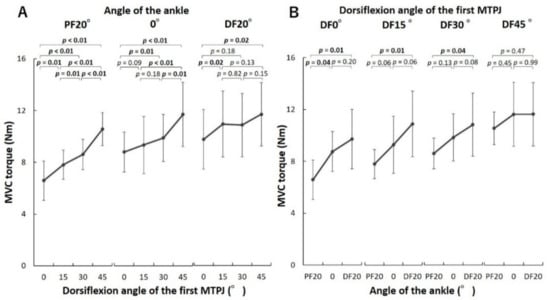 Comparison of the maximal voluntary contraction (MVC) torque of the first metatarsophalangeal joint (MTPJ) at different MTPJ (A) and ankle positions (B). The torque-angle relationship corresponds to the ascending limb at dorsiflexed (DF) 0°–DF45° of the first MTPJ when the ankle was at plantar-flexed (PF) 20° and neutral (0°), and the plateau region at DF15°–45° of the first MTPJ, when the ankle was at DF20°.