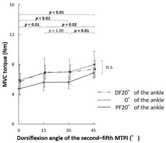 For the second–fifth MTPJ, there was no significant interaction effect between the MTPJs and ankle positions on the MVC torques in the ANOVA (p = 0.28, F = 1.28). However, there was a significant main effect of the MTPJ angles (p < 0.01, F = 20.43). There was no significant main effect of the ankle angles (p = 0.09, F = 3.43). In multiple comparisons of the effect of the MTPJ positions, the MVC torques of the second–fifth MTPJs increased significantly as the MTPJs dorsiflexed in five comparisons (0° and DF15°, 0° and DF30°, 0° and DF45°, DF15° and DF45°, as well as DF30° and DF45°) (Figure 4).