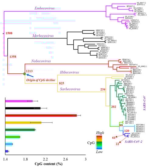 Although a number of previous studies reported about the reduced CpG content of SARS-CoV-2 genomes [14,17,18,20], the present study showed that the CpG content has been progressively declining in this lineage over a longtime. We showed that this depletion might have started in the Sarbecovirus + Hibecovirus clade after it branched off from the Nobecovirus group (Figure 1). Based on the age of this node it is clear that the CpG content in SARS-CoV-2 lineage has been gradually declining over the past 1213 years. The cause for the reduction could be to evade the antiviral zinc finger protein of the hosts that targets CpG nucleotides [22,23]. Since the viral genomes belonging to Sarbecovirus + Hibecovirus groups infects many mammals, including human, bat, civet, pangolin, and mink (Supplementary Table S1), the progressive decline suggests that antiviral activities of zinc finger proteins appear to be similar across these mammals. Although CpG was much lower in the vast majority (>90%) of the SARS-CoV-2 genome, a few small pockets of the genome consisting of UTRs, envelop and nucleocapsid genes were shown to have relatively high CpGs [32]. Our analysis also showed a relatively higher CpG in these regions (3.5%) compared to that observed for the whole genome (2.1%). The combined CpG content of these regions (3.3%) is still lower for SARS-CoV-2 (and its close relatives) compared to Hibecovirus and Nobecovirus genomes (3.6%).