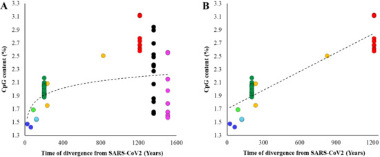 Relationship between divergence times of other betacoronaviruses from SARS-CoV-2 and their CpG contents. The divergence times for each node shown in Figure 1. (A) All genomes were included. The correlation is not significant (ρ = 0.18, p = 0.12). (B) Embecovirus and Merbecovirus genomes were excluded. The correlation is highly significant (ρ = 0.86, p < 0.00001). Best fitting regression lines are shown.