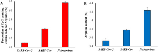 (A) Proportion of CpG containing the codons code for the amino acid arginine in three groups of virus genomes. (B) Proportion of arginine amino acid present in the exomes of SARS-CoV-2 (and its relatives—dark blue in Figure 1), SARS-CoV (dark green in Figure 1) and Nobecovirus (red in Figure 1). Error bars denote standard error of the mean.