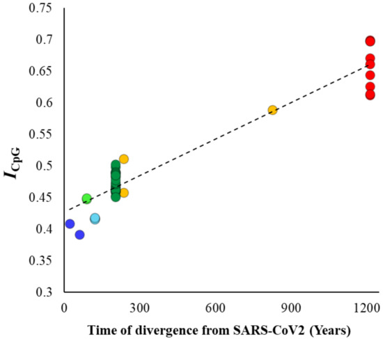 Correlation between the ratio of observed-to-expected CpG contents (ICpG—Equation (2)—see methods) of the betacoronavirus genomes and their respective times of divergence from SARS-CoV-2. The relationship is highly significant (ρ = 0.87, p < 0.00001).
