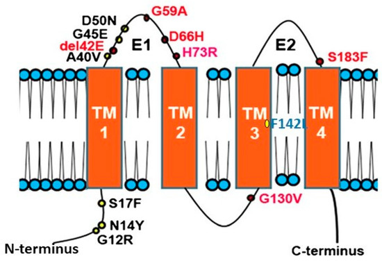 Topology of Connexin 26 and examples of mutations in CX26 associated with epidermal dysplasia and hearing loss. N amino terminus; E1 extracellular loop 1; E2 extracellular loop 2; TM transmembrane domain. Mutations in red indicate ‘Class 2′ black, ‘Class 3′ and blue ‘Class 4′ mutations (see Section 2.2).