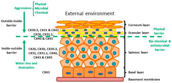 The epidermis, like all other stratified epithelial tissues, is avascular so gap junctions play an important role in cell-to-cell communication and coordination. Up to 10 different connexins are differentially expressed throughout the epidermis, each presenting a characteristic expression profile dependent on the species and conditions. These Connexin profiles allow the establishment of specific gap junction communication compartments in the different strata. Alteration of connexin activity and compatibility may provoke problems in keratinocyte differentiation [5,30,31]. Several studies have demonstrated that connexins are involved in skin conditions such as chronic non-healing wounds, psoriasis and a variety of genetically related skin syndromes (e.g., [32,33,34]).