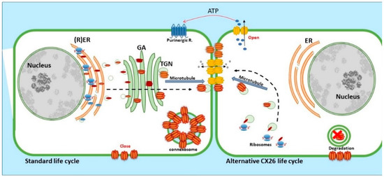 Life cycle of CX26: CX26 can be co-translated and trafficked through the secretory route (standard life cycle). It can also be post-translationally incorporated into ER microsomes and trafficked by Golgi-independent pathway (alternative CX26 life cycle). GJIC mediated communication is indicated between cells and paracrine signalling permitting ATP release indicated via the open hemichannels.