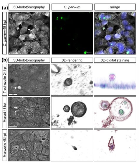 The exact molecular mechanisms on how C. parvum sporozoites attach and penetrate intestinal mucus is still not fully understood [,]. Effective blockage of active C. parvum-sporozoite intestinal mucus migration could constitute an important cornerstone for drug development, since this event is critical for the establishment of infection. Thus, the possibility to follow C. parvum development in live cells and real time enables us to better understand such fundamental events. Accordingly, the label-free RI-based digital staining has successfully been used to unveil the intracellular architecture and parasite-host cell interactions of related apicomplexans [,] and, more recently, cytopathogenic effects of viruses []. In this sense, we here presented first live cell 3D-holotomographic microscopy analyses of C. parvum infection. The, refractive index- and nanoscale membrane fluctuation-based analyses revealed feasible and non-invasive approaches to study sporozoite host cell invasion and early sporozoite/host cell interactions [,,].