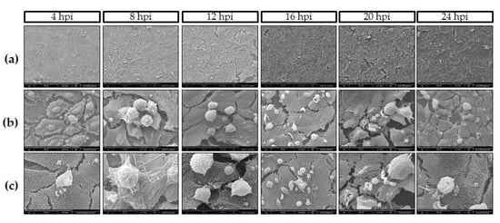 Moreover, “hole”-like cell membrane damages associated with C. parvum meront- and/or gamont-driven ruptures of infected host cells were evidenced by SEM analysis, confirming superficial host epithelial cell features in affected villi in vivo. SEM analyses visualized gradual C. parvum replication resulting in trophozoite-like structures since 4 h p. i. (Figure 2c) and massively observed at 16 h p. i. (Figure 2a). As stated above, also C. parvum-infected host cells showed hole-like cell membrane damage after meront rupture, (Figure 2b, 16 h p. i. white arrow), evidencing that some C. parvum trophozoites underwent very fast development into mature meront stages and released merozoites in vitro. In addition, villi-like structures were also evidenced by SEM-analysis in C. parvum-infected host cells carrying meront stages (Figure 2c, 4 and 12 h p. i. black arrows) as previously reported elsewhere [].
