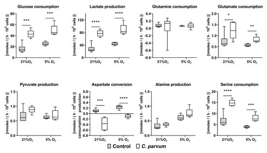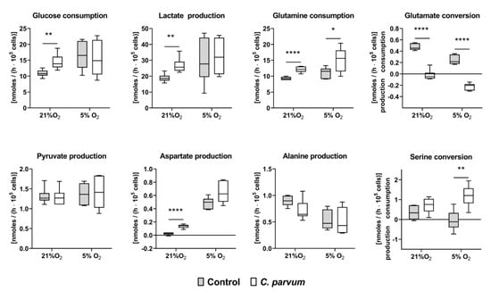 Glucose, lactate, pyruvate, aspartate, glutamine, glutamate, alanine and serine conversion rates in uninfected and C. parvum-infected HCT-8 cultivated in glutamine-starved medium (0.02 mM) at hyperoxia (21% O2) and physioxia (5% O2) (n = 6, each group). In comparison to glutamine-supplemented cultivation conditions the parasite infection rate slightly dropped in glutamine starved medium (21% O2: 40 ± 3%; 5% O2: 28 ± 7%). Conversion rates were analysed at 48 h p. i. in the cell culture supernatants of the cells. Metabolic conversion rates are plotted as interleaved box and whiskers plots showing minimum to maximum values with line at the medians. Statistical significance (* = p ≤ 0.05, ** = p ≤ 0.01, *** = p ≤ 0.001, **** = p ≤ 0.0001) was determined by t-test for independent samples.