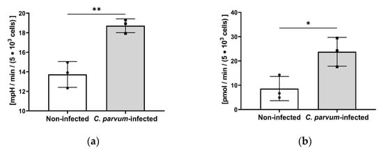 In order to further analyze the role of glycolysis and glycolytic-derived ATP production, we subjected C. parvum-infected HCT-8 cells to Seahorse XFp-based analyses on glycolytic responses. Here, glycolytic rate assays revealed an increase of glycolysis in C. parvum-infected HCT-8 cells (p > 0.005; Figure 5a) when compared to non-infected host cells. Likewise, a significant increase in glycolytic ATP production was observed (C. parvum-infected vs. control cells: p = 0.0111; Figure 5b) confirming glycolysis’s pivotal role as an energy source for C. parvum.