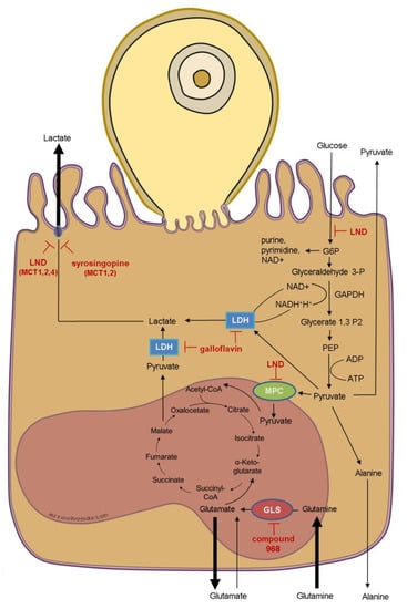 Schematic summary of the metabolic impact of C. parvum infection on HCT-8 cells cultivated in presence of 2 mM glutamine and 21% oxygen and targets of selected inhibitors. Bold arrows indicate impact on metabolic conversion rates of C. parvum-infected host cells (compare Figure 3). Based on C. parvum-induced alterations of host cell metabolism, the indicated metabolic inhibitors were selected to investigate their potential to inhibit C. parvum infection in HCT-8 cells. LND: lonidamine, MPC: mitochondrial pyruvate carrier, GLS: glutaminase, LDH: lactate dehydrogenase, MCT: monocarboxylate transporter.
