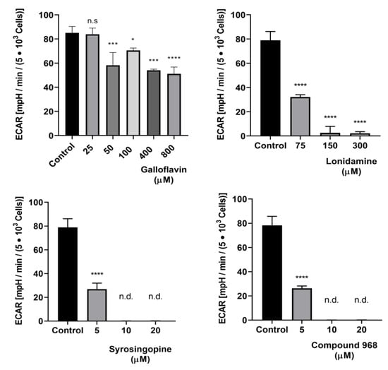 In preceding dose finding studies, all inhibitors were pretested in uninfected HCT-8 cells for toxicity and glycolysis-lowering effects at different micromolar concentrations (galloflavin: 25, 50, 100, 200, 400, 800, 1600 µM; lonidamine: 75, 150, 300, 600 µM; syrosingopine and compound 968: 5, 10, 20. 40, 80, 160, 320 µM). Overall, there was no evidence of cell toxicity under the treatment ranges used here as detected by both XTT assay and LDH measurements. For controls, cells were mock-treated with 0.1% DMSO (vehicle) representing 100% viability. For positive controls (for cell death), cells were treated with 10% Triton X-100 (Figures S2 and S3). In addition, no alteration of host cell phenotype was visible microscopically at any of the here selected treatment-inhibitor concentration (data not shown). As measured by Glycolysis Stress Test Kit® (Agilent, Rathingen, Germany), all inhibitors led to a significant reduction of glycolysis in uninfected cells, even though to different extents (Figure 7, Figures S5–S8). Of note, compound 968, which represents a potent glutaminase inhibitor, also showed a highly significant glycolysis-blocking efficacy at low micromolar range (10–20 µM, Figure 7).