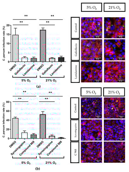 Effects of galloflavin (400 µM), lonidamine (150 µM) (a), syrosingopine (10 µM) and compound 968 (10 µM) (a,b) treatments on C. parvum infection rates in HCT-8 cells cultivated at 21% O2 and 5% O2, and exemplary illustrations of respective inhibition assays. C. parvum was stained with VVL, green; host -cell membranes and nuclei were labelled with anti-ß-catenin (red) and Hoechst (blue), respectively. Bars show means ± SD, (n = 6). For evaluation of significance t-test was performed. ** = p ≤ 0.01.