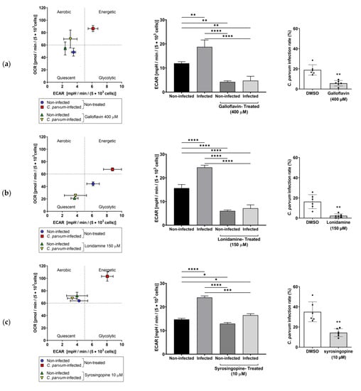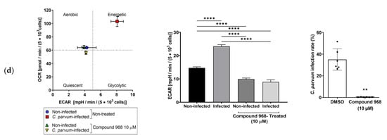 The related test protocol includes initial measurements of basal non-glycolytic acidification, followed by reactions upon sequential supplementation of glucose (induces glycolysis), oligomycin (blocks ATP synthase) and 2-deoxy-D-glucose (blocks glycolysis) (for back-calculation of glycolytic reserve) via instrument-own injection ports. Energetic maps (Figure 9, first column) revealed that C. parvum infection was generally linked to a shift towards a high energetic status and likewise to a rise of glycolysis (Figure 9, second column) when compared to non-infected control cells. When inhibitors were applied, the high energetic status of cells changed and moved back towards the lower energetic status of non-infected control cells. The overall energetic behaviour of inhibitor-treated cells was mirrored by decreased ECAR values. Inhibitor-induced decreases in glycolytic activity was also related with a significant reduction in C. parvum infection rates (p = 0.0022 for all treatments) (third column of Figure 9). Related data on the glycolytic capacity, glycolytic reserve and non-glycolytic acidification are presented in supplementary files (Figures S5–S8).