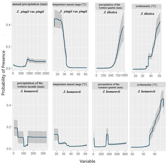 In comparison, isothermality (Bio3) was the most important predictor for the potential distribution of J. tibetica and J. komarovii, where it contributed 20.4% and 38.3%, respectively. (Table 1). In response to Bio7 (annual temperature range), the probability of the presence of J. pingii var. pingii showed sharp declines after 25 °C (Figure 1). Moreover, Bio7 showed a gradual decline in the cases of J. tibetica and J. komarovii and became almost constant after a temperature of 35 °C. Similarly, the likelihood of the presence of J. tibetica increased with the increase in precipitation of the wettest quarter (Bio16). The probability of the presence of J. tibetica and J. komarovii increased gradually with the increase in isothermality (Bio3) (Figure 1).