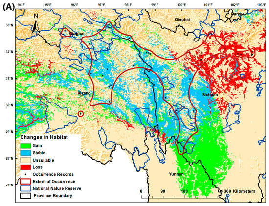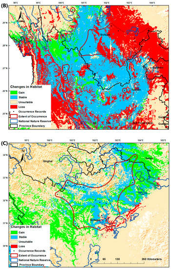 The results also showed that the best potential suitable habitats (gained and stable) for J. tibetica were predicted to be in the southeast parts of Sichuan Province (Figure 2A), while the predicted suitable habitats for J. pingii var. pingii (Figure 2B) and J. komarovii (Figure 2C) were mainly in the northern parts of Yunnan Province. These potential areas could be investigated for the possible occurrence of new or undiscovered populations of Juniperus species. Potential suitability maps of the target species under present and future climate scenarios are shown in Figure S1.