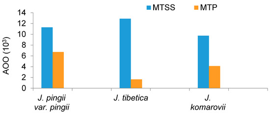 The projected status of all species was up-listed to the highest category of extinction risk “extinct”, based on 100% loss in the projected AOO (according to IUCN Red List Criterion A3 (C)) under both climate and dispersal scenarios (Table 2). The potential AOO showed high significant variation between the two thresholds (MTSS and MTP), particularly for J. tibetica (Figure 3).