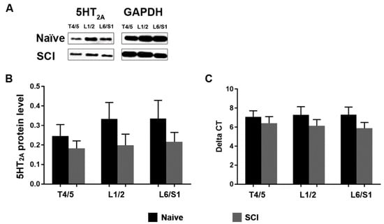 Spinal 5-HT2A receptor expression remains unchanged after SCI. (A), Western blots show that there is no difference between naïve and SCI rats in terms of protein expression levels of the 5-HT2A receptor above (T4/5) and below the level of injury (L1/2, L6/S1) (Student’s t-test, all p > 0.05). (B,C), Quantitative PCR analysis reveals that mRNA levels of this receptor were not altered at any of the aforementioned segments in SCI rats (all p > 0.05). GAPDH served as a control.