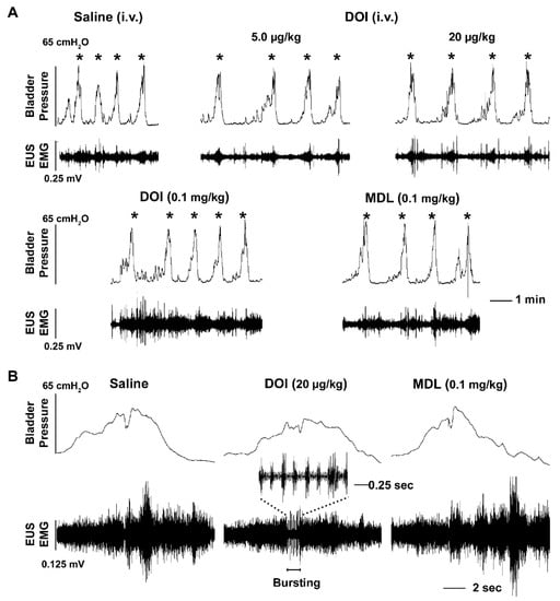 - Chen, J.; Gu, B.; Wu, G.; Tu, H.; Si, J.; Xu, Y.; Andersson, K.E. The effect of the 5-HT2A/2C receptor agonist DOI on micturition in rats with chronic spinal cord injury. J. Uro. 2013, 189, 1982–1988. [Google Scholar] [CrossRef] [PubMed]