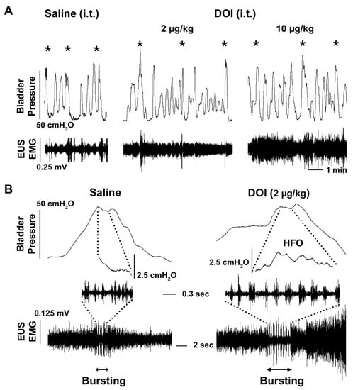 Intrathecal (i.t.) administration of DOI to stimulate 5-HT2A receptors affects the micturition reflex during bladder cystometry and sphincter EMG in SCI rats. (A), Representative tracers show that stimulating 5-HT2A receptors with the middle (2 µg/kg) and high (10 µg/kg) doses of DOI prolongs the VI (both p < 0.05, Friedman’s test followed by Dunn’s) between voiding contractions (asterisks) and induces an increase in EUS tonic activity. (B), Importantly, the middle dose of DOI increases the duration of EUS bursting that consists of more regularly occurring active and silent periods along with bladder HFO, indicating an enhancement of detrusor-sphincter coordination during voiding.