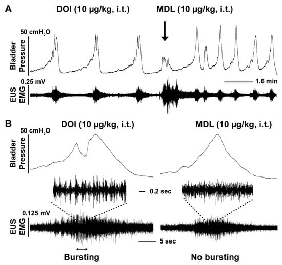 Three to four weeks after SCI, rats were anesthetized with 2% isoflurane and an incision was made in the lower abdomen to expose the bladder. The apex of the bladder dome was punctured using a 20-gauge needle. One end of a catheter (PE-60; Clay Adams, New York, NY, USA) was inserted into the bladder [26]. The abdominal wall was then sutured closed with the other end of the catheter protruding from the sutured area to allow for infusion of saline into the bladder. To obtain EUS electromyography (EMG) recordings, the pubic symphysis was removed to expose the urethra and EUS. Two fine-wire electrodes (AstroNova, West Warwick, RI, USA) with exposed tips were percutaneously inserted on both sides of the EUS. Alternatively, two internal electrodes were placed on both sides of the EUS via the opening of the pubic symphysis. In rats receiving intravenous (i.v.) delivery of pharmacological agents (n = 6), a separate cannula (PE-10) filled with saline was implanted in the right femoral vein. In rats receiving intrathecal (i.t.) delivery of drugs or vehicle (n = 6), an ITC 32G catheter (ReCathCo, Allison Park, PA, USA) was placed underneath the dura at the 1st/2nd lumbar spinal cord level (L1/2) and the tip of the catheter was further advanced to the L6/S1 level [27]. In both i.v. and i.t. delivery, rats received injections of gradually increased doses of MDL and then increasing doses of DOI followed by blockage with MDL.