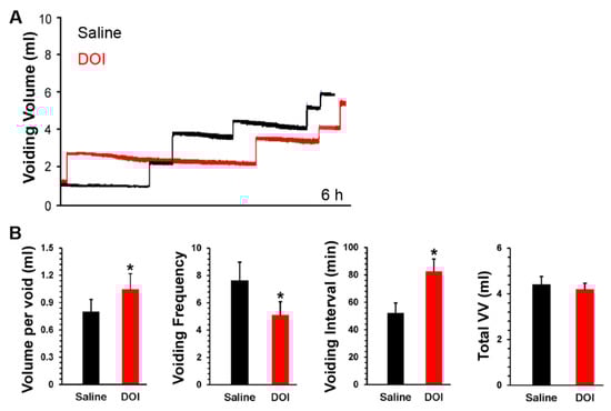 Stimulating 5-HT2A receptors with DOI delivery improves spontaneous micturition function in SCI rats. Representative traces show volume-frequency patterns of urination in metabolic cage assays after 5-HT2A receptor stimulation with DOI within a 6-h time period. Saline injections served as a control. In each “step-like” curve of these traces (A), the vertical lines represent the VV per void and the horizontal lines illustrate the VI. After s.c. injection of the 5-HT2A receptor agonist DOI (60 µg/kg, 300 µL), (B) there was a significant increase in the VV per void and VI in comparison to saline controls (Paired t-test, all * p < 0.05).