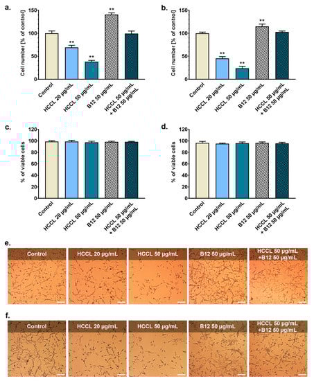 The culture of U-87 MG glioblastoma cells was examined after exposure to HCCL (20 or 50 µg/mL), B12 (50 µg/mL) or HCCL (50 µg/mL) in combination with B12 (50 µg/mL) for 9 or 18 days. The analysis involved cell counting, viability assay and microscopic imaging. As demonstrated in Figure 1, HCCL and B12 significantly influenced cell proliferation but not viability. After nine days of the experiment, the number of cells in the culture exposed to 20 µg/mL or 50 µg/mL HCCL was reduced by approximately 30% or 62%, respectively (Figure 1a). The antiproliferative effect of HCCL increased with the treatment duration. After 18 days of culturing with 20 µg/mL or 50 µg/mL HCCL, the cell population was reduced by approximately 55% or 76%, respectively, as compared to the control (Figure 1b). In contrast, the cell number in the B12-treated culture exceeded the control by approximately 40% or 14% after 9 or 18 days, respectively. At each time point, the proliferation rate of cells co-treated with HCCL and B12 was at the control level (Figure 1a,b). As shown in Figure 1c,d the percentages of viable cells were >95% under all tested conditions. Analysis of microscopic images obtained on day 9 (Figure 1e) and 18 (Figure 1f) supported the cytometric cell counting data, as a noticeable reduction in the cell number in the HCCL-treated cultures, as well as an increase in confluence in B12-treated cells was observed, revealed a significant reduction in the cell number in HCCL-treated cultures as well as a significant increase in confluence in B12-treated cells. No marked morphological differences were observed between the control and cells treated with HCCL and/or B12.