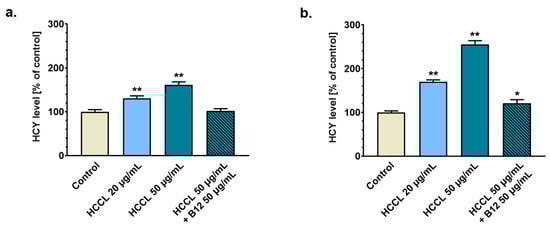 An increase in HCY level reflects a dysfunction in cellular metabolism due to Cbl deficiency [23]. We estimated the HCY level in media from cell culture exposed to HCCL at concentrations of 20 µg/mL and 50 µg/mL. To investigate a putative opposite action of HCCL and B12, we also analyzed media samples from cell culture co-treated with HCCL (50 µg/mL) and B12 (50 µg/mL). As presented in Figure 2a, cell cultures treated with 20 µg/mL or 50 µg/mL HCCL for 9 days had elevated extracellular HCY levels to ca. 130% or 160% of the control value, respectively. We found that this effect increased considerably with a duration of exposure to HCCL. On day 18 of the experiment, the HCY level in the medium of cells treated with 20 µg/mL or 50 µg/mL HCCL was about 1.7- or 2.5-fold higher, respectively, than the control value (Figure 2b). As shown in Figure 2a,b, combined treatment of U-87 MG cells with HCCL and B12 resulted in a complete (in the case of nine-day culture) or partial (in the case of 18-day culture) antagonization of the HCCL-induced HCY accumulation.