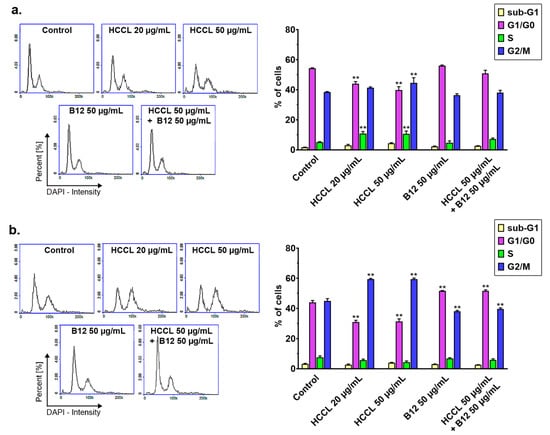 Figure 3 shows the results from the cell cycle assay of U-87 MG cells following 9- and 18-day treatments with HCCL (20 or 50 µg/mL), B12 (50 µg/mL) or HCCL in combination with B12 (each at a concentration of 50 µg/mL). According to Figure 3a, HCCL in both studied concentrations induced a two-fold increase of cell fraction in the S phase when cells were exposed to the agent for 9 days. Moreover, the agent at a concentration of 50 µg/mL caused a slight increase in the percentage of cells in the G2/M phase compared to the control. Combined treatment of U-87 MG cells with HCCL and B12 gave a pattern of cell cycle distribution as for the controls. Similarly, the nine-day cultivation of cells in the only B12-enriched medium did not affect the progression of the cell-division cycle. As shown in Figure 3b, an extension of the treatment time to 18 days resulted in an increase of the percentage of cells in the G2/M phase: from approximately 45% (control level) to approximately 60% (HCCL at both tested concentrations), suggesting the G2/M cell cycle arrest under cobalamin deficiency. There were no significant differences in the fraction of apoptotic cells with fragmented DNA (cells in the sub-G1 phase) between the control and treated cultures.