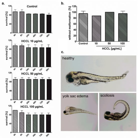 The embryos exhibiting normal development were gathered at 0 h post-fertilization (hpf) and transferred into 24-well plates in standard E3 medium (as a control) and a series of concentrations of HCCL solution (10, 50, and 100 μg/mL), until 96 hpf. The experiment was carried out in triplicate and eight embryos were used for each group. The zebrafish embryos were maintained in an environmentally controlled room (26.0 ± 1.0 °C with a light/dark cycle). The embryos were exposed to the test compounds as previously described [26,27] with modifications. Several lethal, sublethal, and teratogenicity points were observed including hatching rate, edema, tail detachment, somite formation, and scoliosis by observation under a stereomicroscope equipped with a camera. The survival rates and morphological deformities of the fertilized eggs were examined and documented at 4, 8, 24, 48, 72, and 96 hpf. The mortality and morphological deformations rates were calculated with GraphPad Prism software.
