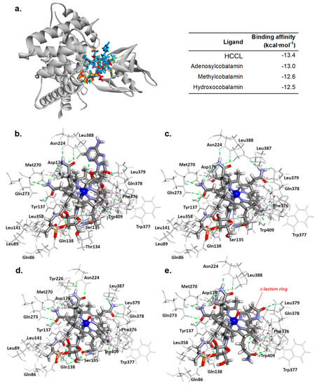 In silico molecular docking results. Docking pose of TCII protein complex with adenosylcobalamin (blue), methylcobalamin (green), hydroxocobalamin (orange), and HCCL (red)—left panel; binding parameters of transcobalamin II-ligand complexes—right panel (a). Predicted binding model of adenosylcobalamin (b), methylcobalamin (c), hydroxocobalamin (d), and HCCL (e) with transcobalamin II.