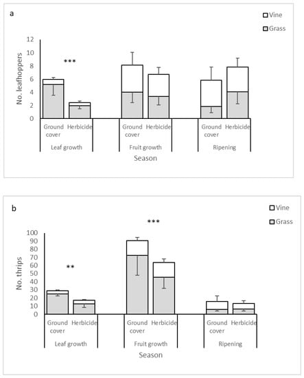 - Danne, A.; Thomson, L.; Sharley, D.; Penfold, C.; Hoffmann, A. Effects of native grass cover crops on beneficial and pest invertebrates in Australian vineyards. Environ. Entomol. 2010, 39, 970–978. [Google Scholar] [CrossRef] [PubMed]