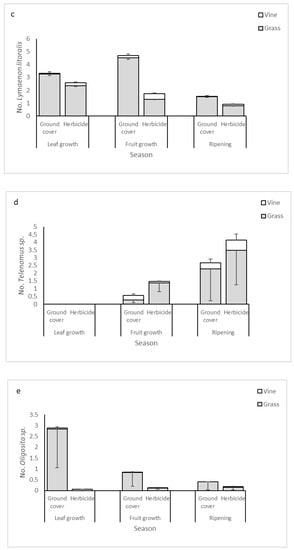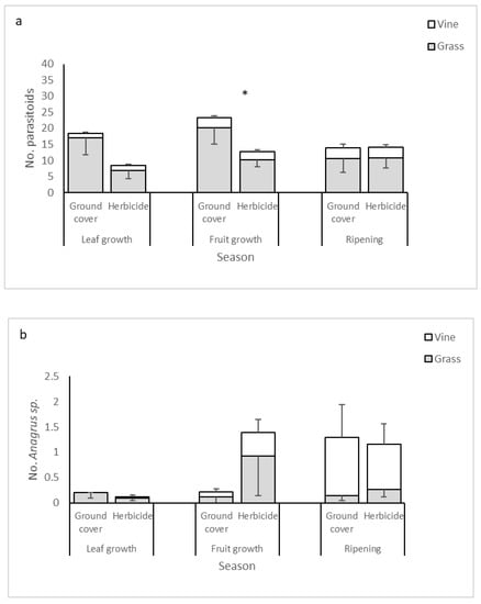 Leafhoppers, potential hosts of L. litoralis, Oligosita sp., and Anagrus sp., were more abundant in the ground cover plots than in the herbicide plots, especially during leaf growth. They occupied both the vine and the grass habitats (Table 1, Figure 3a). Thrips, potential hosts of Ceranisus sp., were also more abundant in the ground cover treatment than in the herbicide treatment, peaked during fruit growth and were sampled mainly in the grass habitat (Table 1, Figure 3b).