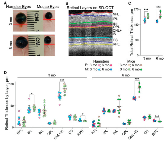 Comparative biometric assessments of hamster vs. mouse eyes and retina. (A): Representative images of hamster (3 females and 3 males) and mouse (4 females and 3 males) eyes at 3 months (3 mo) and 6 months (6 mo) of age. (B): The reference image of mouse retina provided by the Diver software to show how retinal layers in hamsters and mice were defined for quantifications by spectral-domain optical coherence tomography (SD-OCT). (C): Total retinal thickness by SD-OCT in 3-month-old hamsters (5 females and 6 males), 3-month-old mice (5 females and 7 males), 6-month-old hamsters (6 females and 4 males), and 6-month-old mice (4 females and 4 males). (D): Retinal thickness by layer in 3-month-old hamsters (5 females and 6 males), 3-month-old mice (5 females and 7 males), 6-month-old hamsters (6 females and 4 males), and 6-month-old mice (4 females and 4 males). No sex-based differences were detected, hence data from female and male animals were combined. Data represent the mean ± SD of the measurements in individual animals after the data from both eyes were averaged. Statistical significance was assessed by an unpaired non-parametric Mann–Whitney test. * p ≤ 0.05; ***, p ≤ 0.001. F, females; M, males; NFL, the nerve fiber layer; IPL, the inner plexiform layer; INL, the inner nuclear layer; OPL, the outer plexiform layer; ONL, the outer nuclear layer; IS, the photoreceptor inner segments; OS, the photoreceptor outer segments; RPE, the retinal pigment epithelium.
