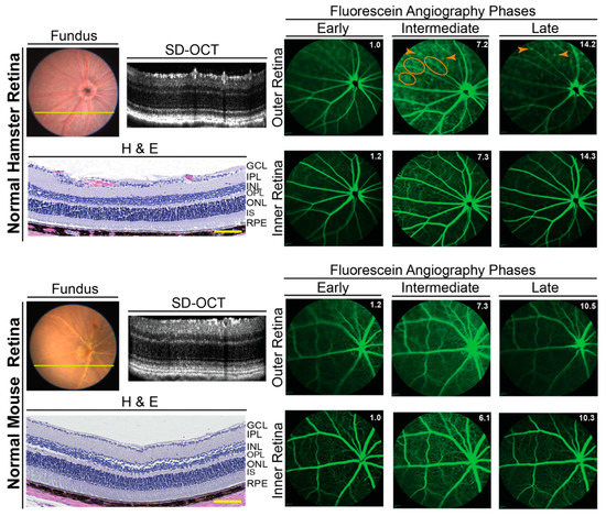 In vivo imaging of hamster and mouse retina. Representative (9 female and 9 male hamsters at 3 months of age; 9 female and 9 male hamsters at 6 months of age; 6 female and 6 male mice at 6 months of age) assessments by fundus color imaging (Fundus), spectral domain-optical coherence tomography (SD-OCT), and fundus fluorescein angiography after an injection with sodium fluorescein. No sex- and age-dependent differences were detected, hence only images of male animals are shown. The same representative animal (hamster or mouse) was used for the acquisition of all images. The SD-OCT panels shows retinal cross sections. Histology of the retinal cross sections after H&E stains is shown for comparison. The fluorescein angiography panels show an early-, intermediate-, and late-stage fundus fluorescence (from left to right) as defined by the post-injection time of image acquisition. This time (in minutes) is shown as white numbers in the upper right corner of each panel. The laser beam was focused on either the outer retina or inner retina, which are nourished by the choroidal and intraretinal vascular networks, respectively. Orange ovals and arrowheads on fluorescein angiography indicate diffused margins of some of the retinal capillaries and bright fluorescent spots, respectively. The retinal layer labeling is as described in Figure 1. GCL, the ganglion cell layer. Scale bars = 100 µm.