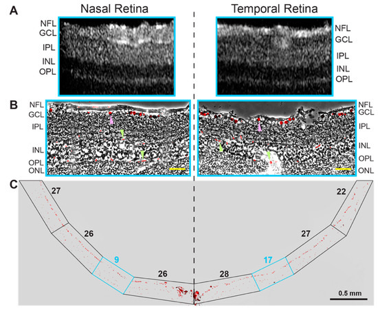 Localization of area centralis in hamster retina. Images of a representative retina (2 female and 3 male hamsters) were used, which was characterized by SD-OCT (A) and a stain for BRN3A (B,C). (B): An overlay of the BRN3A stain on the phase contrast image of the retina, which corresponds to the region in the cyan box in (A,C). Magenta arrowheads point to the BRN3A staining of the ganglion cells, whereas green arrowheads indicate staining of red blood cells inside the retinal blood vessels. (C): the BRN3A staining of the entire retinal cross section. Boxed regions indicate segments of the retina, in which the BRN3A-positive cells in the ganglion cell layer were counted and indicated by a number above the boxed region. The retinal layer labeling is as described in Figure 1 and Figure 2. Yellow scale bars = 50 µm.