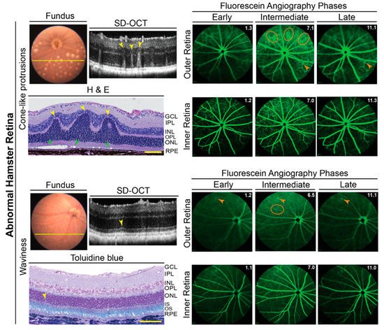 Abnormalities in hamster retina as assessed by in vivo imaging and histology. Representative images (two females and one male for cone-like protrusions; one female and three males for retinal waviness) are of fundus, retinal SD-OCT, fundus fluorescein angiography after an injection with sodium fluorescein, and histology with H&E and toluidine blue stains. For each pathology type (cone-like protrusions and retinal waviness), the same hamster was used for acquisition of all images. Yellow lines on fundus photos indicate location of abnormality seen on SD-OCT. Yellow arrowheads indicate structural abnormalities detected by both SD-OCT and histology. Green arrowheads indicate the degeneration of the photoreceptor outer segments revealed only by histology. Orange ovals and arrowheads indicate diffused margins of some of the retinal capillaries and bright fluorescent spots, respectively, on fluorescein angiography. For fluorescein angiography imaging, the laser beam was focused on either the outer retina or inner retina, which are nourished by the choroidal and intraretinal vascular networks, respectively. White numbers in the upper right corner of each fluorescein angiography panel indicate the post-injection time (in minutes) of image acquisition. The retinal layer labeling is as described in Figure 1 and Figure 2. Scale bars = 100 µm.