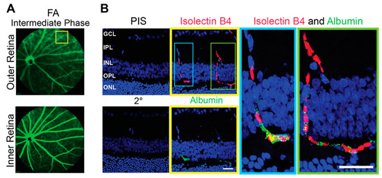Increased permeability of the retinal blood vessels in hamsters. (A): Representative image (4 females and 3 males either with structurally normal or abnormal retinas, the staining pattern was the same) of a fundus fluorescein angiography (FA) showing an area (yellow box) of increased vasopermeability in the outer retina. (B): The boxed area in (A) as assessed by control stains with pre-immune serum (PIS) and secondary antibody only (2°) and stains for the blood vessels with isolectin B4 (red) and albumin (green). Nuclei were stained with DAPI. The magnification of the cyan and green boxed regions in the latter two are also shown. The retinal layer labeling is as described in Figure 1 and Figure 2. Scale bars = 25 µm.
