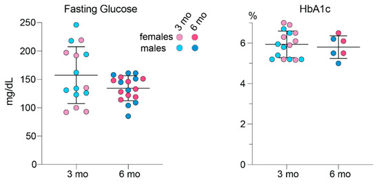 Leakage of plasma from small intraretinal blood vessels into the interstitial space of the surrounding retina is a manifestation of early stage diabetic retinopathy [43]. Furthermore, Chinese hamsters are known to spontaneously develop diabetes [44,45]. Hence, we measured the hamster fasting blood glucose and HbA1c content, the latter being an indicator of long-term blood sugar control. At both 3 and 6 months of age, the levels of blood glucose and HbA1c were not significantly different between female and male hamsters and between the age groups (Figure 6). Notably, young hamsters had a higher interindividual variability in their fasting blood glucose levels with the ranges in females and males being 92–219 mg/dL and 123–246 mg/dL, respectively. The ranges in mature animals were smaller: 114–155 mg/dL in females and 85–161 mg/dL in males. Nevertheless, hamster variability in the blood HbA1c levels was not as high, thus suggesting that the blood glucose variability in young hamsters could possibly be due to the physiological stress caused by sedation. Overall, the mean blood glucose values in mature (6-month-old) hamsters (135 mg/dL in females and 134 mg/dL in males) were close to some of the reported values in the literature for Syrian hamsters (82 and 134 mg/dL in females; 72 and 120 mg/dL in males) [1,46]. Yet the mean HbA1c values (6.0 HbA1c% in females and 5.6 HbA1c% in males) were higher than those determined in non-diabetic Chinese hamsters of the same age but unspecified sex (~5 HbA1c%) [44].