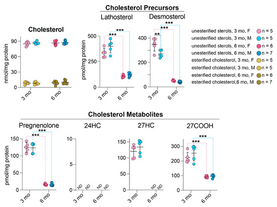 Retinal sterols in hamsters. Female (F) and male (M) animals were 3- and 6-months old (mo). Data represent the mean ± SD of the measurements in one retina in each hamster; n = number of hamsters. Statistical significance was assessed by one-way ANOVA with Tukey’s multiple comparisons test. No sex-based differences (except for desmosterol levels) were detected. **, p ≤ 0.01 ***, p ≤ 0.001. 24HC, 24-hydroxycholesterol; 27HC, 27-hydroxycholesterol; 27COOH, 5-cholestenoic acid; F, females; M, males; ND, not determined (the limit of detection is 1 pmol/mg protein).